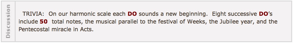 On the harmonic scale of your piano, the numbers go like this: 1, 2, 3, 4, 5, 6, 7, 8, 9, 10, 11, 12, 13, 14, 15, 16, 17, 18, 19, 20, 21, 22, 23, 24, 25, 26, 27, 28, 29, 30, 31, 32, 33, 34, 35, 36, 37, 38, 39, 40, 41, 42, 43, 44, 45, 46, 47, 48, 49, 50. Each bold face number is a DO, a new beginning. The eighth DO (50)is Pentecost & Jubilee, each a new beginning of new beginnings.